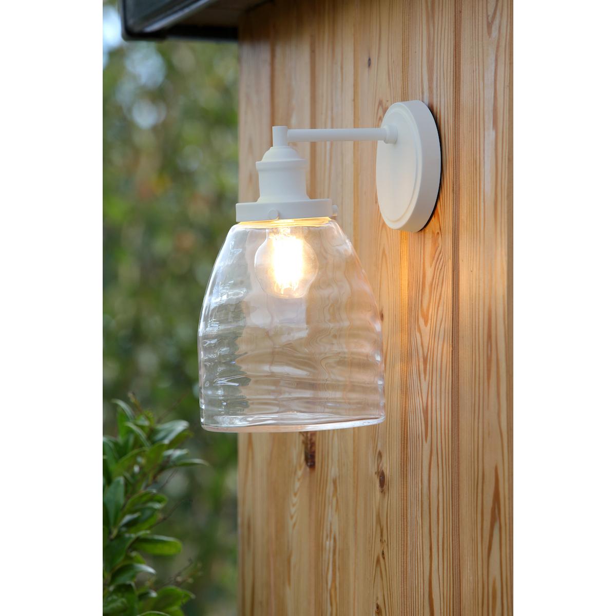 The Ainsworth wall light is a graceful wall light fitted with an enclosed clear wavey glass, this exterior wall light has a matt powder-coated finish. This is a perfect outdoor light fitting for beside or over a doorway.