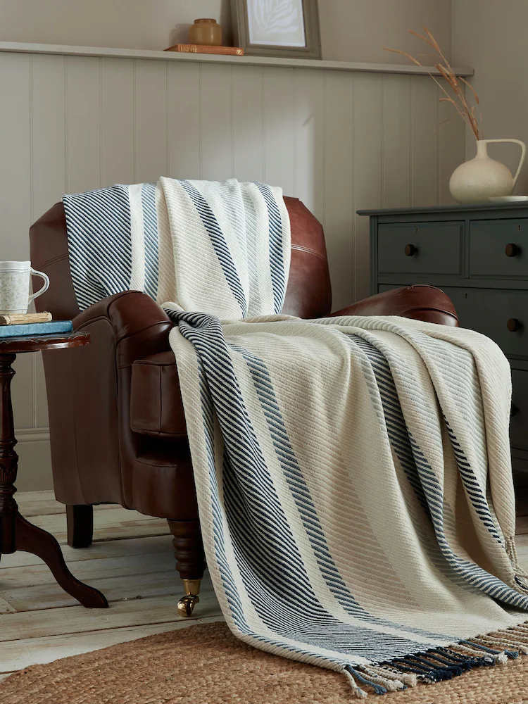 Awning stripe throw is a timeless design in a fresh Seaspray blue colourway. Woven from 100% cotton with tassel edge detailing, this classic design will freshen up any interior.