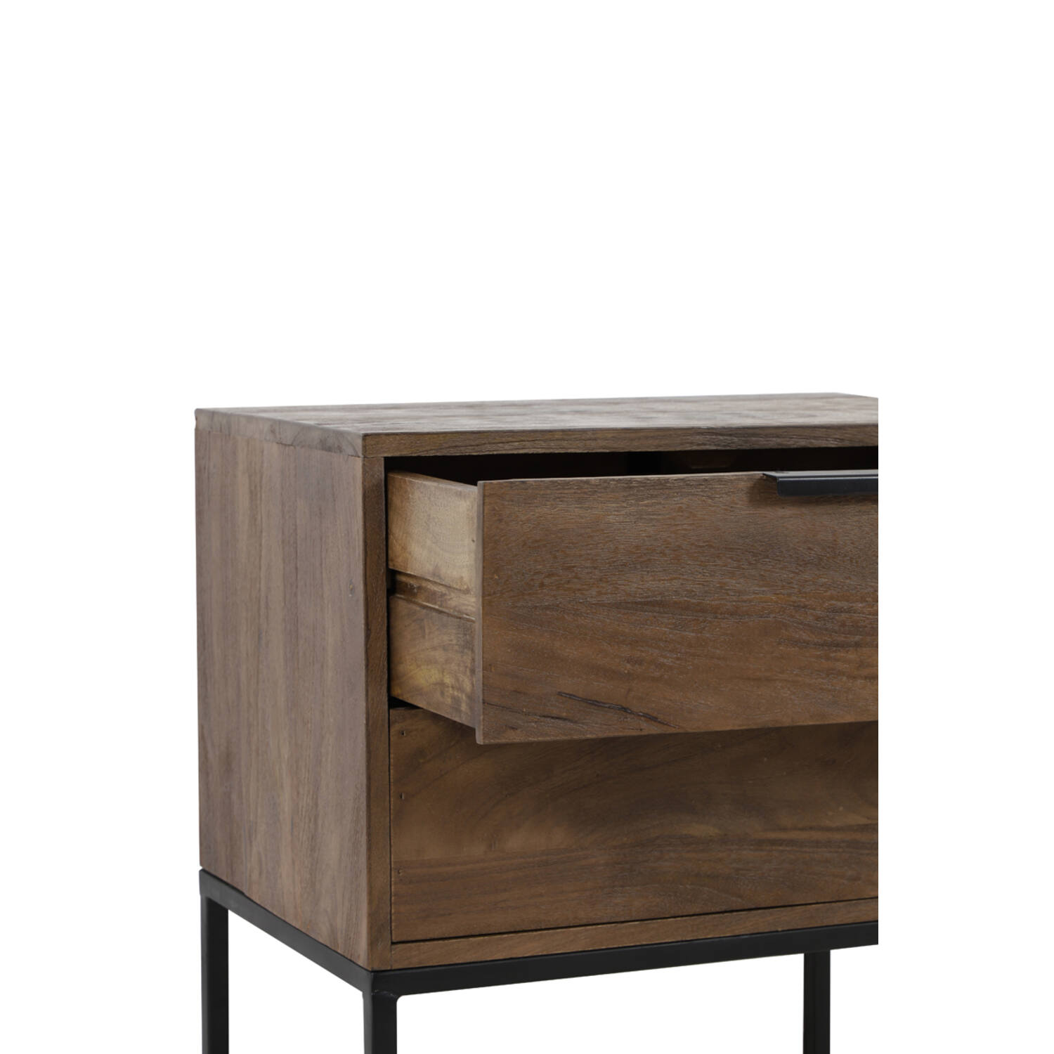 The stylish Light & Living bedside table combines the beauty of natural wood with modern minimalist design. The warm wood tone paired with an elegant black metal frame creates a balanced and timeless look that fits perfectly with a variety of interior styles.