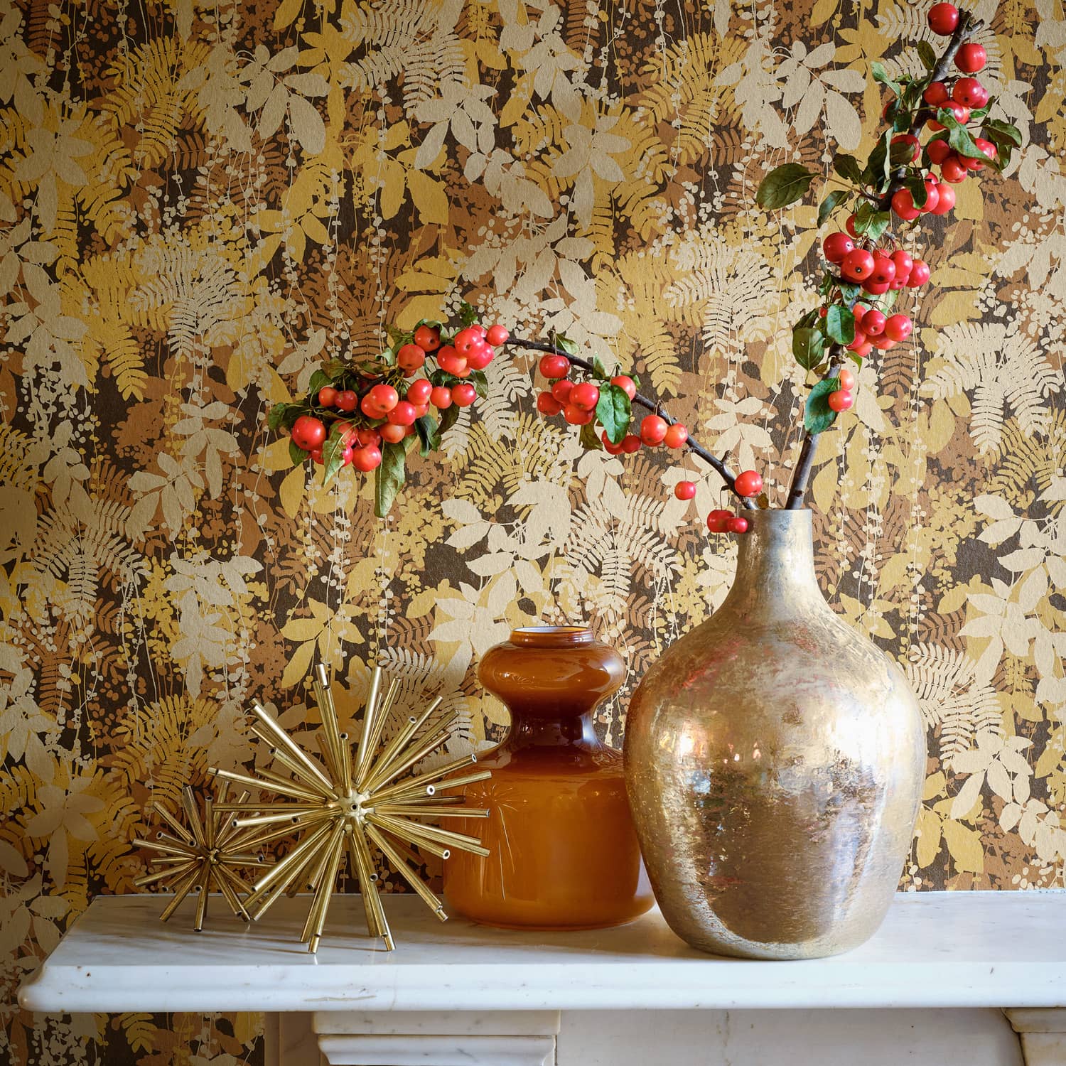 The Canopy Wallpaper, in antique gold and olive green palette, captures the vibrant elegance of nature. Clarissa the designer became entranced by the intricate patterns of the forest canopy while out walking in the woodlands of Wiltshire. You will find your eyes are drawn to the luxuriant foliage of this captivating wallpaper, where every leaf, stem and vine layer over one another to create exquisite patterns.