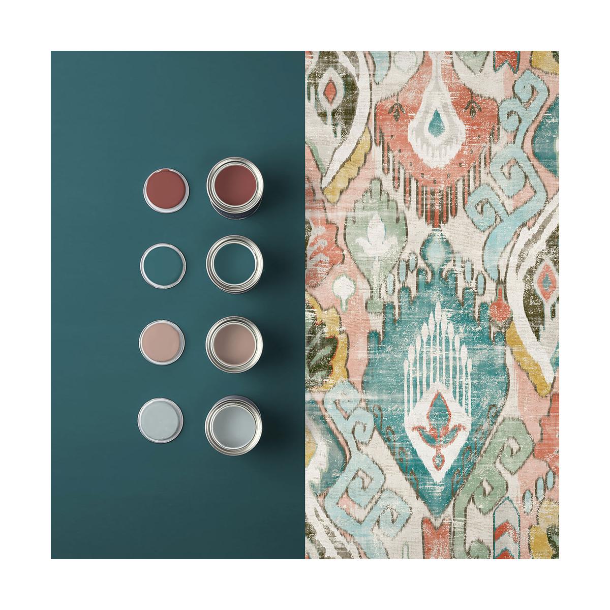 This Persian inspired tapestry wallpapers name Daraee and means wealth. A technique often celebrated as one of the most intricate and prized exports of Persia. A technique still common across homes around the globe today. Celebrate a traditional colour combinations with red, blue and teals all working together.