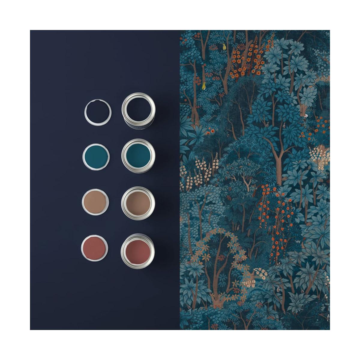 Set in the twilight hours, New Eden Navy takes a darker turn. Our deep blue Terrazzo paint coordinates with the dark depth of colour running through the wallpaper designs background. Accessorise with the accent colours in mind for your room scheme, either with our Tiru paint or Alizarin last years Colour of the Year.