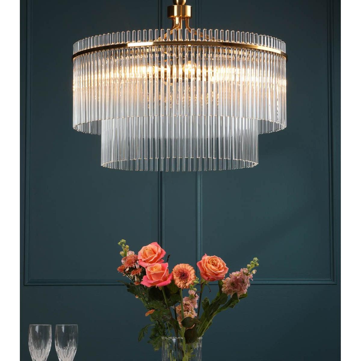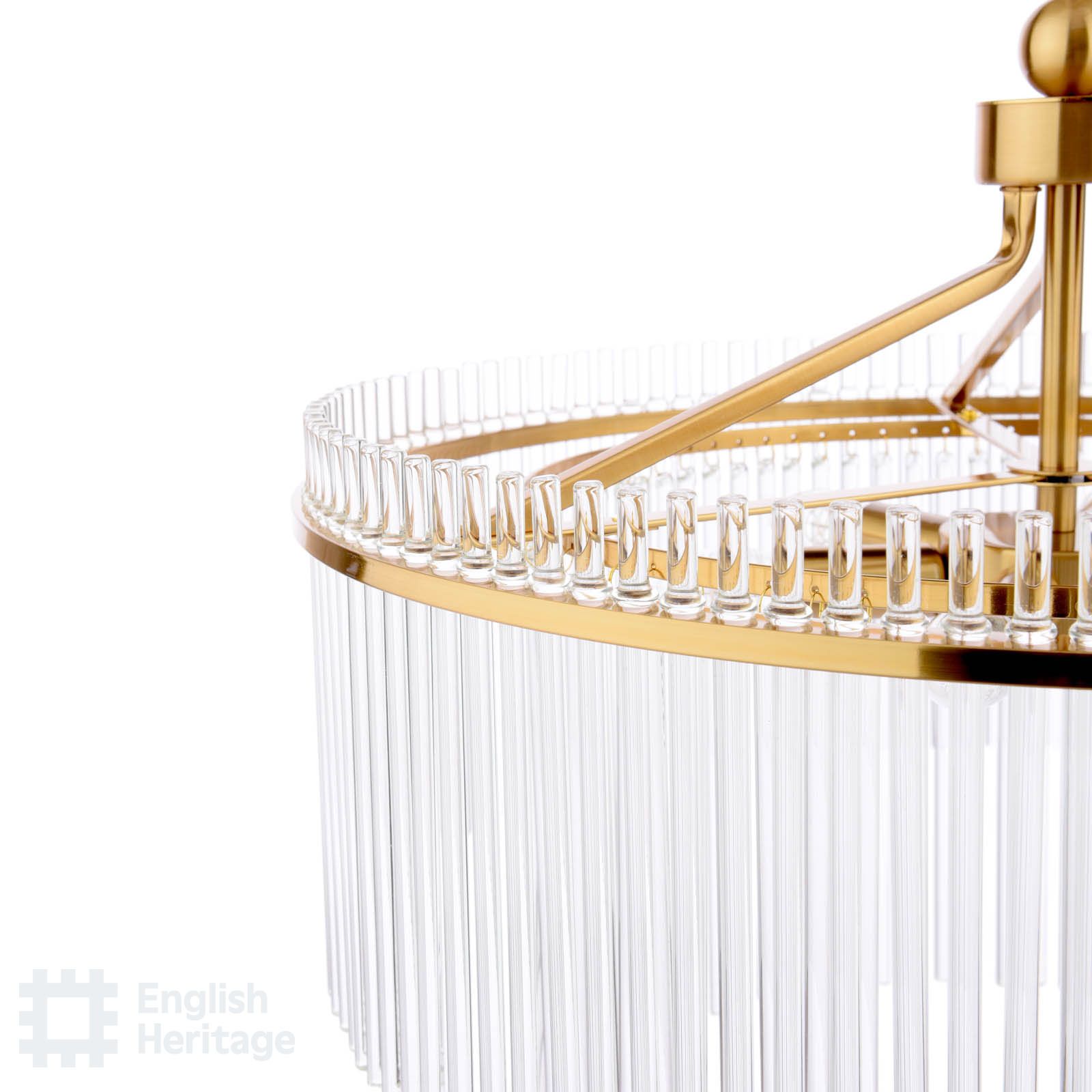 Part of the English Heritage lighting collection, inspired by the striking interiors of Eltham Palace, this chandelier reflects the restrained glamour and architectural confidence of the property’s Art Deco heritage. Layers of slender glass rods form a refined, tiered silhouette, gently diffusing the light to create a warm and atmospheric glow. Finished in an antique gold, the design feels decorative yet balanced, making it a beautiful statement piece for dining rooms, stairwells or living spaces. Elegant and expressive, it brings a sense of heritage sophistication and timeless luxury to the home.