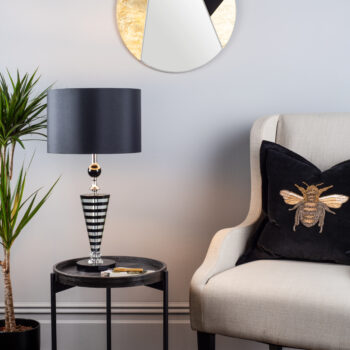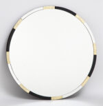 A round mirror embellished with black and gold leaf edging.