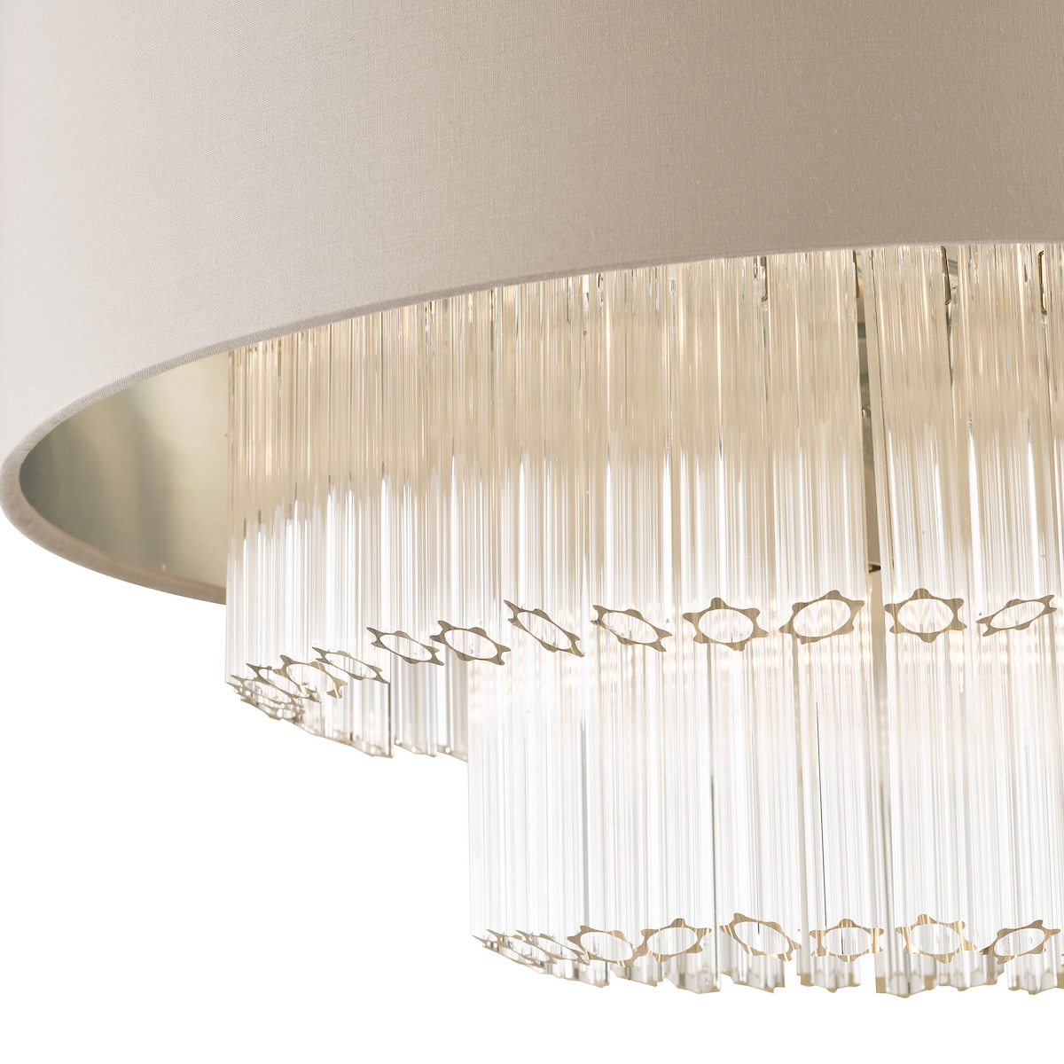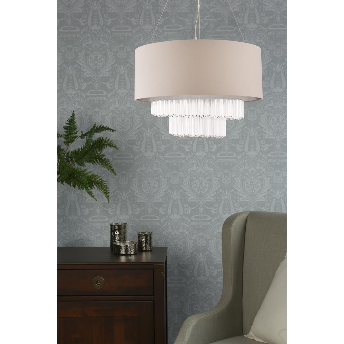 Elegant design with graceful style; the theatrical Geneviève, is a charming ceiling pendant that is resonant with the Art Deco period but with a contemporary in polished chrome finish. Dressed with two tiers of heavy, fluted tubes of glass, cut at an angle to soften the outline, it is wrapped in a shallow cylindrical shade covered in grey faux silk.