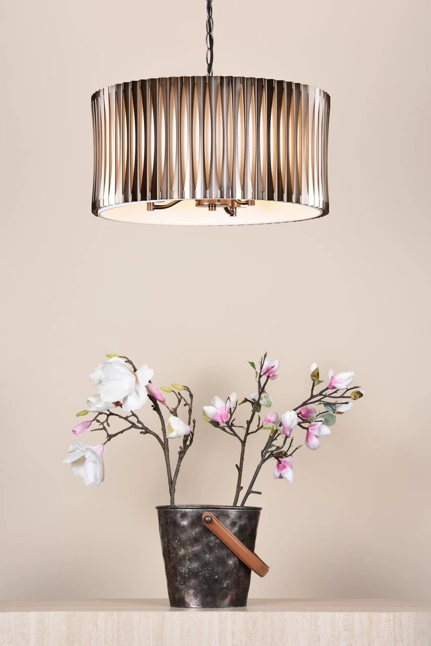 The Netra 3 Light Pendant offers a beautifully layered design that blends structure with softness. Finished in satin bronze, the outer framework is formed from slender vertical metal strips, carefully spaced to reveal the ivory inner shade beneath. This open design allows light to glow through gently, creating depth and visual interest while maintaining a warm, ambient feel. Ideal for dining areas or living spaces, Netra delivers a refined statement with an elegant balance of texture and illumination.