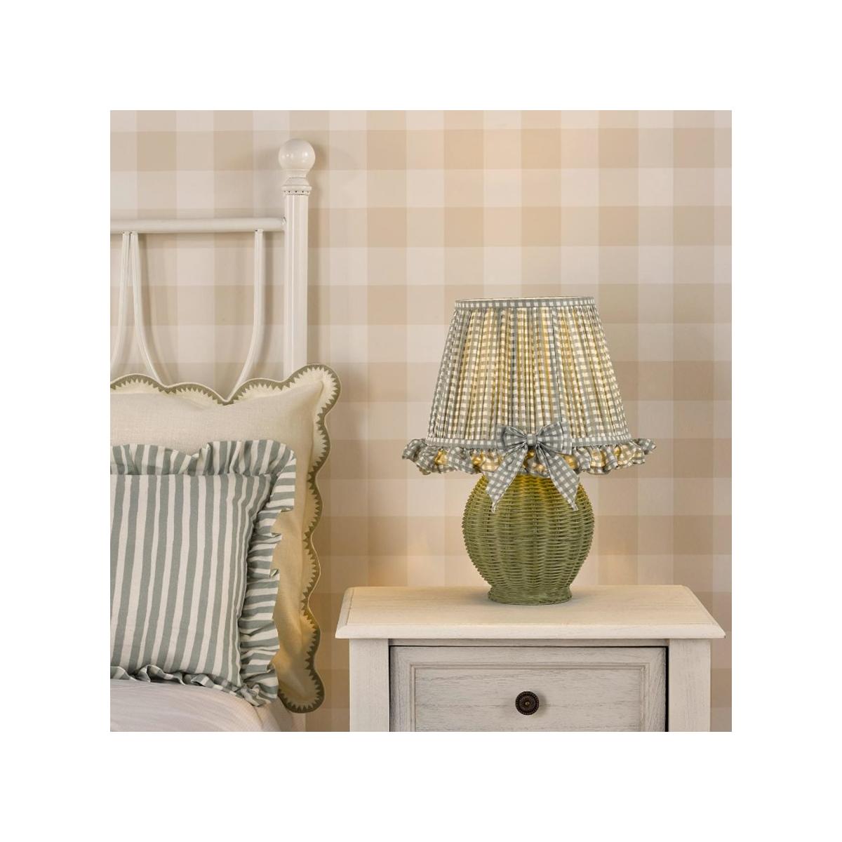 The Omer Table Lamp brings cottage-core charm and timeless country style to interiors. Its resin base is hand finished to mimic natural raffia in a soft green, adding warmth and texture. Paired with a gathered pale green gingham shade with frilled edge and bow detail, it creates an irresistibly homely look. A crisp white lining ensures a gentle glow, while the luxury green braided cable and in-line switch add refinement. Perfect for bedsides, consoles, kitchen dressers or cosy corners, Omer blends nostalgia with fresh farmhouse elegance.