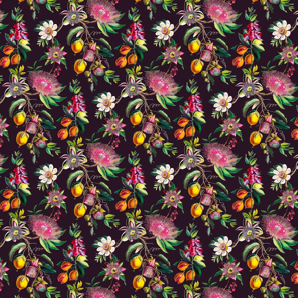 Introducing our Physic Garden, this exquisite floral pattern is filled with a delightful fusion of fruit and flowers. This captivating design effortlessly combines the timeless elegance of a deep purple backdrop with the vibrant, bright colours of nature’s bounty. The intricate details of the pink and white floral motifs and the luscious yellow fruits create a enchanting blend, making it a perfect choice for adding a touch of creativity to a space. Crafted with meticulous attention to detail, this versatile pattern is sure to enhance the aesthetic appeal of your home or office decor.