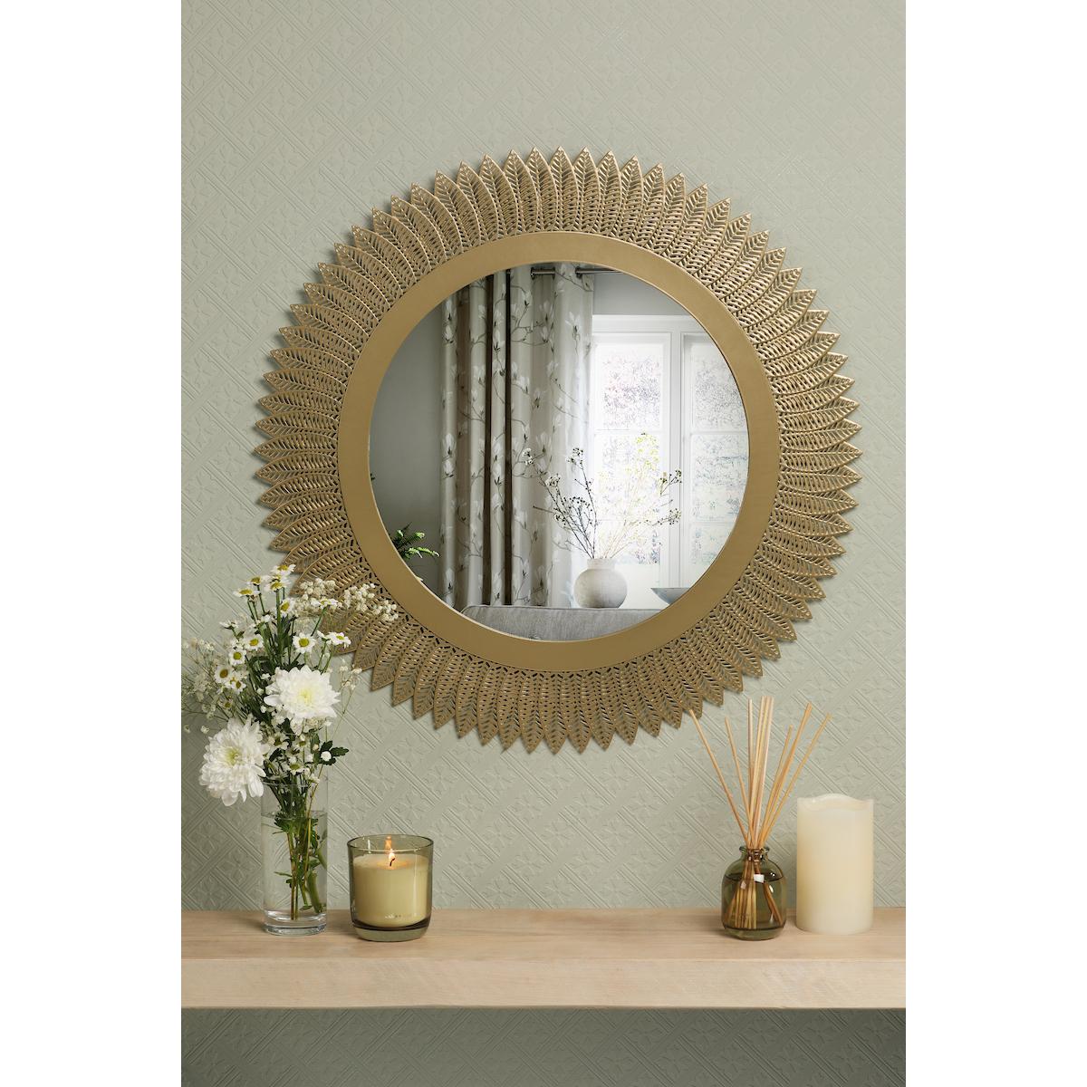 Add a touch of nature-inspired elegance to your walls with this stunning mirror. The round silhouette is beautifully adorned with delicate metal leaves in a sophisticated brushed gold finish, creating a subtle shimmer that catches the light just so. This mirror does more than just reflect – it’s a statement piece that brings both function and artistry to any room.