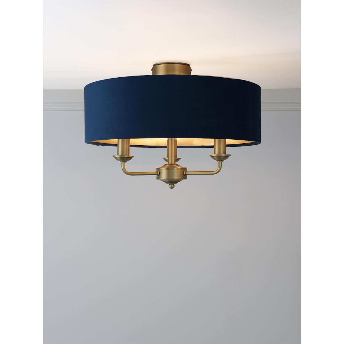 Sorrento Semi Flush Ceiling Light features three lights encased in a single contemporary drum shade in a blue velvet with a metallic sinner. The three-light ceiling pendant comes in a painted matt antique brass finish, adding a sophisticated atmosphere to your dining or living area.
