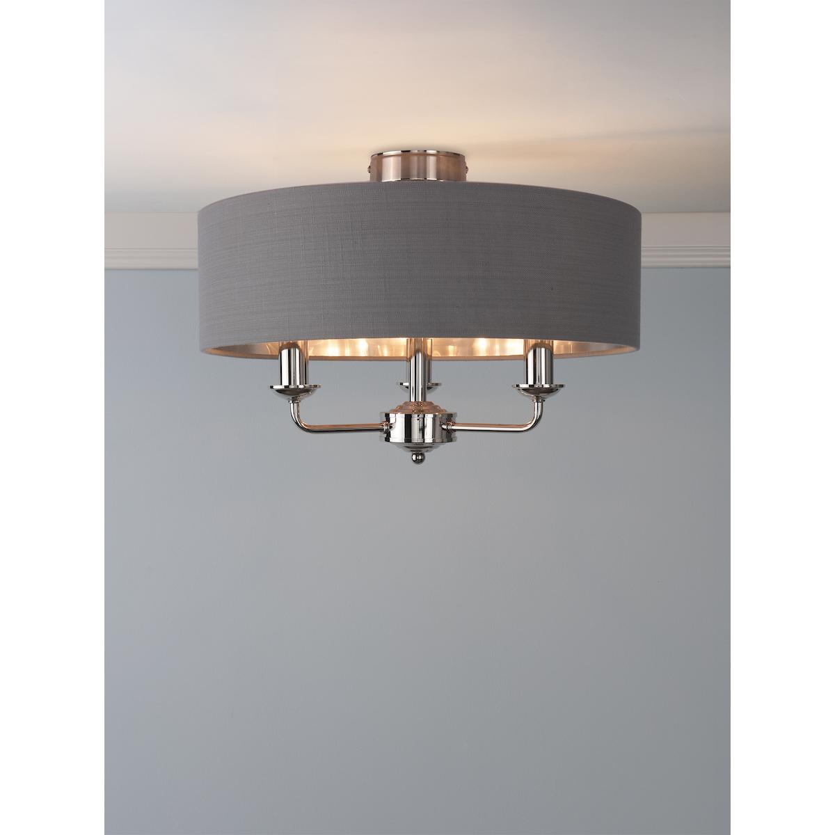 Sorrento Semi Flush Ceiling Light features three lights encased in a single contemporary drum shade in charcoal with a metallic inner. The three-light ceiling pendant comes in a painted nickel finish, adding a sophisticated atmosphere to your dining or living area.