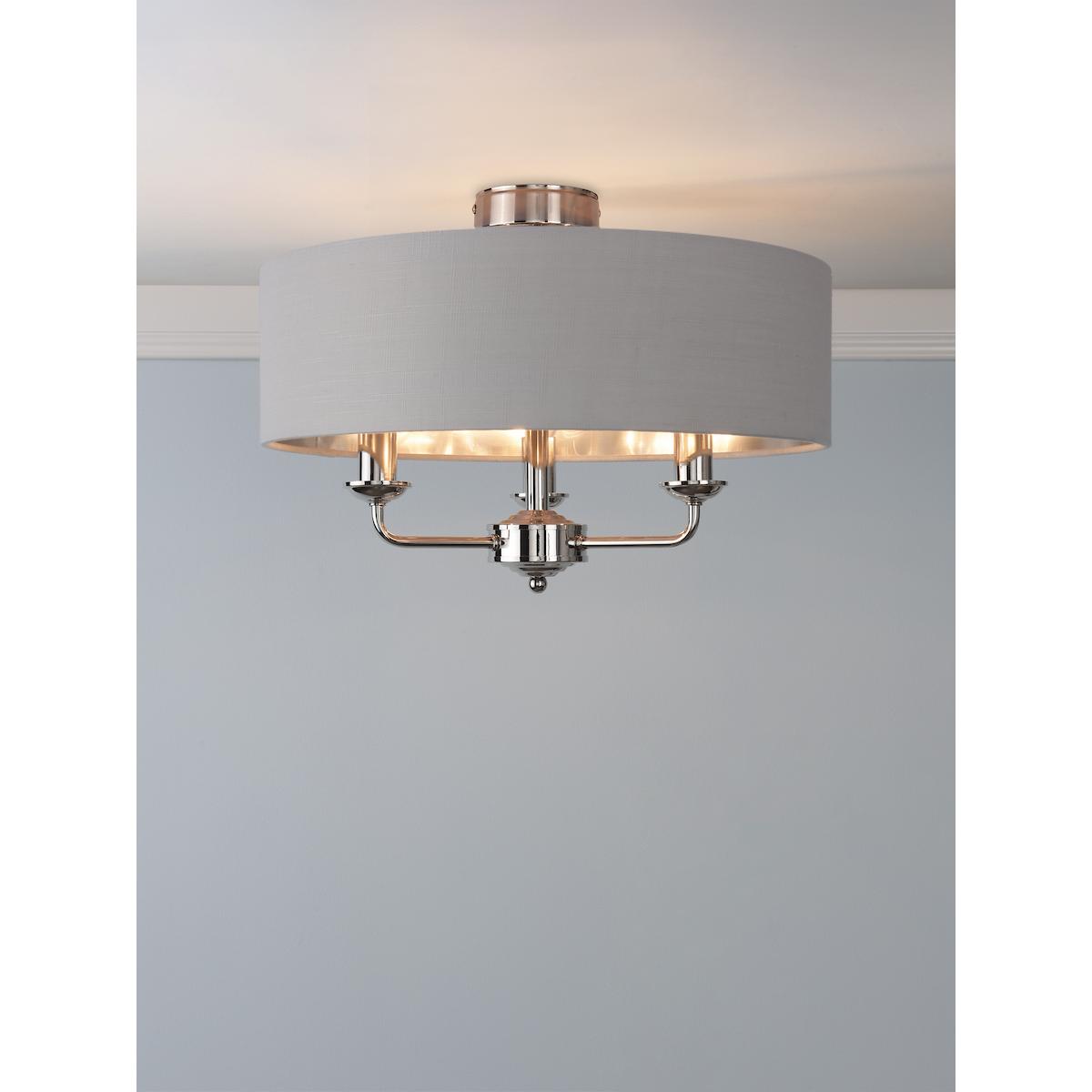 Sorrento Semi Flush Ceiling Light features three lights encased in a single contemporary drum shade in silver with a metallic inner. The three-light ceiling pendant comes in a painted nickel finish, adding a sophisticated atmosphere to your dining or living area.