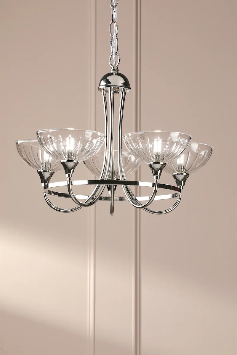 The Wellham Five-Armed Ceiling Light is a beautifully crafted chandelier, making a grand statement in any room. Add a touch of sophisticated luxury to your living spaces or bedrooms with this stunning piece, featuring exquisitely cut glass shades and a polished nickel finish. Its adjustable hanging height allows you to customise the ambience—hang it low for an intimate glow or raise it higher for a dramatic effect. With its timeless, polished design, this chandelier transforms any room into an elegant space.
