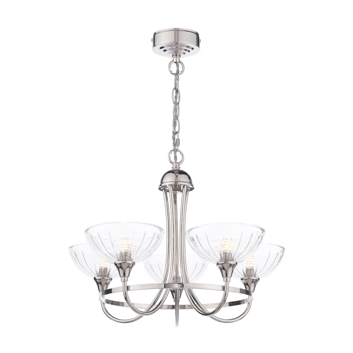 Wellham 5 Light Armed Pendant Polished Nickel and Ribbed Glass