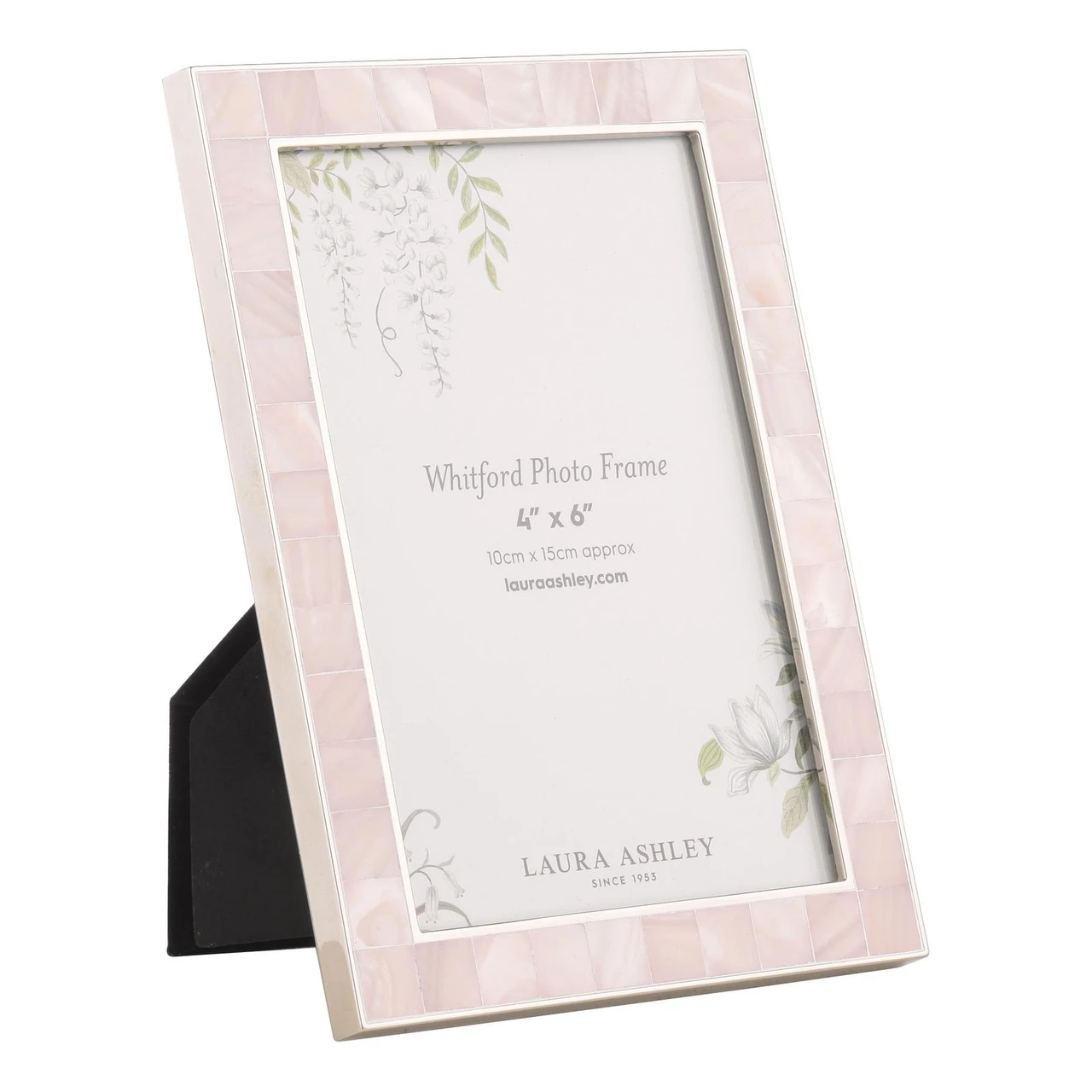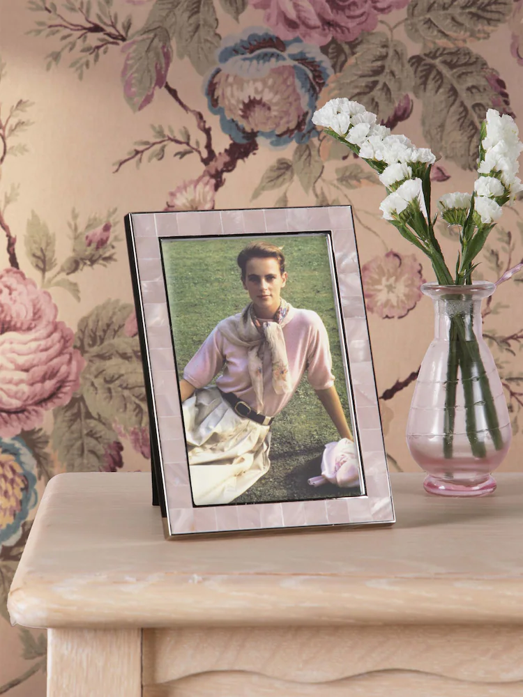 Cherish life’s special moments forever with the Whitford 4″ x 6″ photo frame in pale pink. This exquisitely crafted frame exudes quiet sophistication with its mother of pearl inlays and soft pink hue.