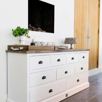 Driftwoodi klaaskapil on valge papli puitraam, mis näitab kaunist kontrasti triivpuuga. See vastupidava iseloomuga puit pärineb Indiast ja on pärit vanadelt kuuri ustelt.