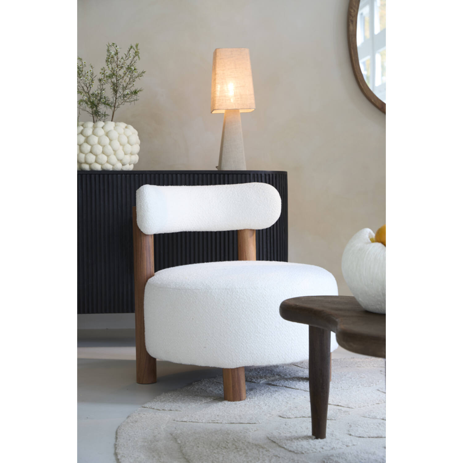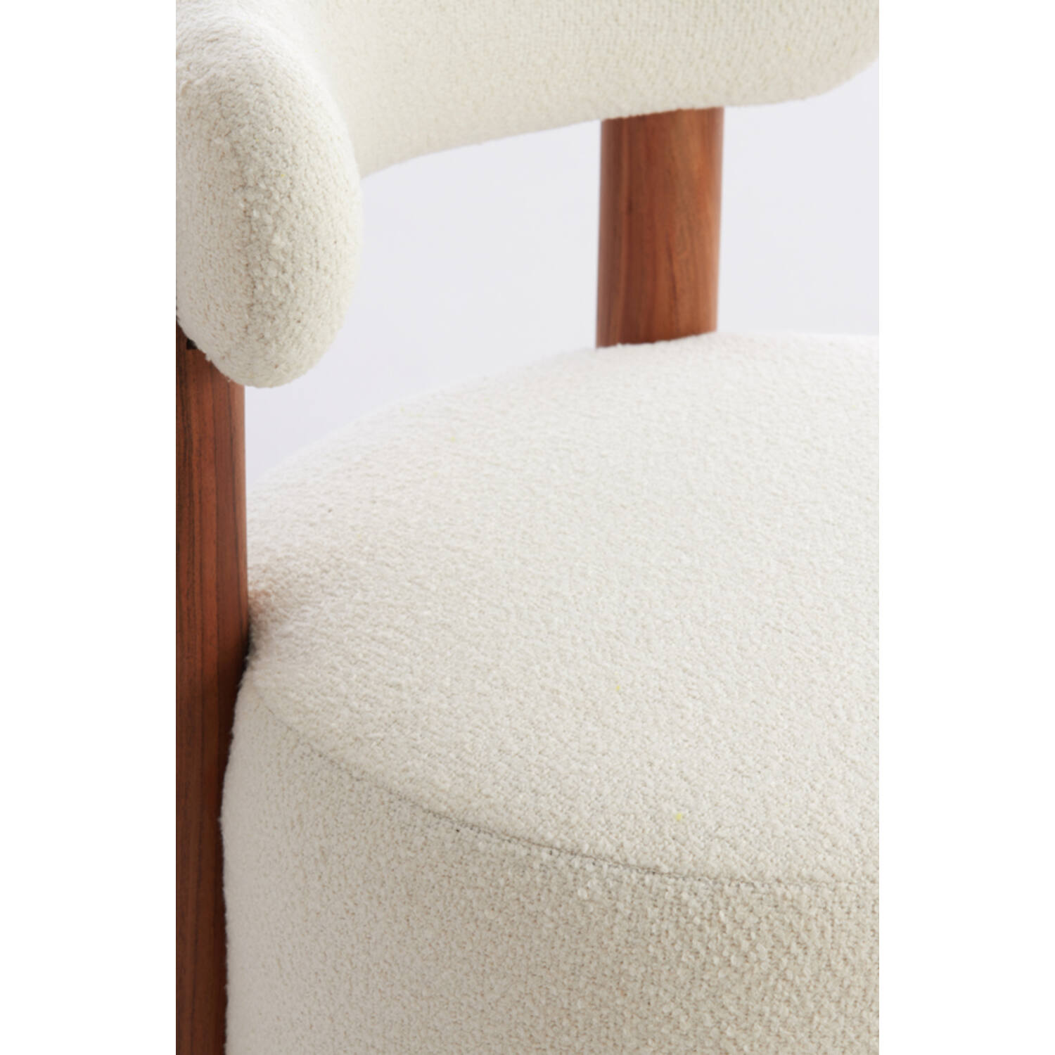 Tugitool Ferentino Natural – looduslik soojus ja modernne vorm.Ferentino tugitool ühendab endas skulpturaalse disaini ja hubase mugavuse. Pehme bouclé-kattega iste ja seljatugi loovad kutsuva istumiskogemuse, samal ajal kui naturaalsest puidust jalad lisavad soojust ja ajatut iseloomu.